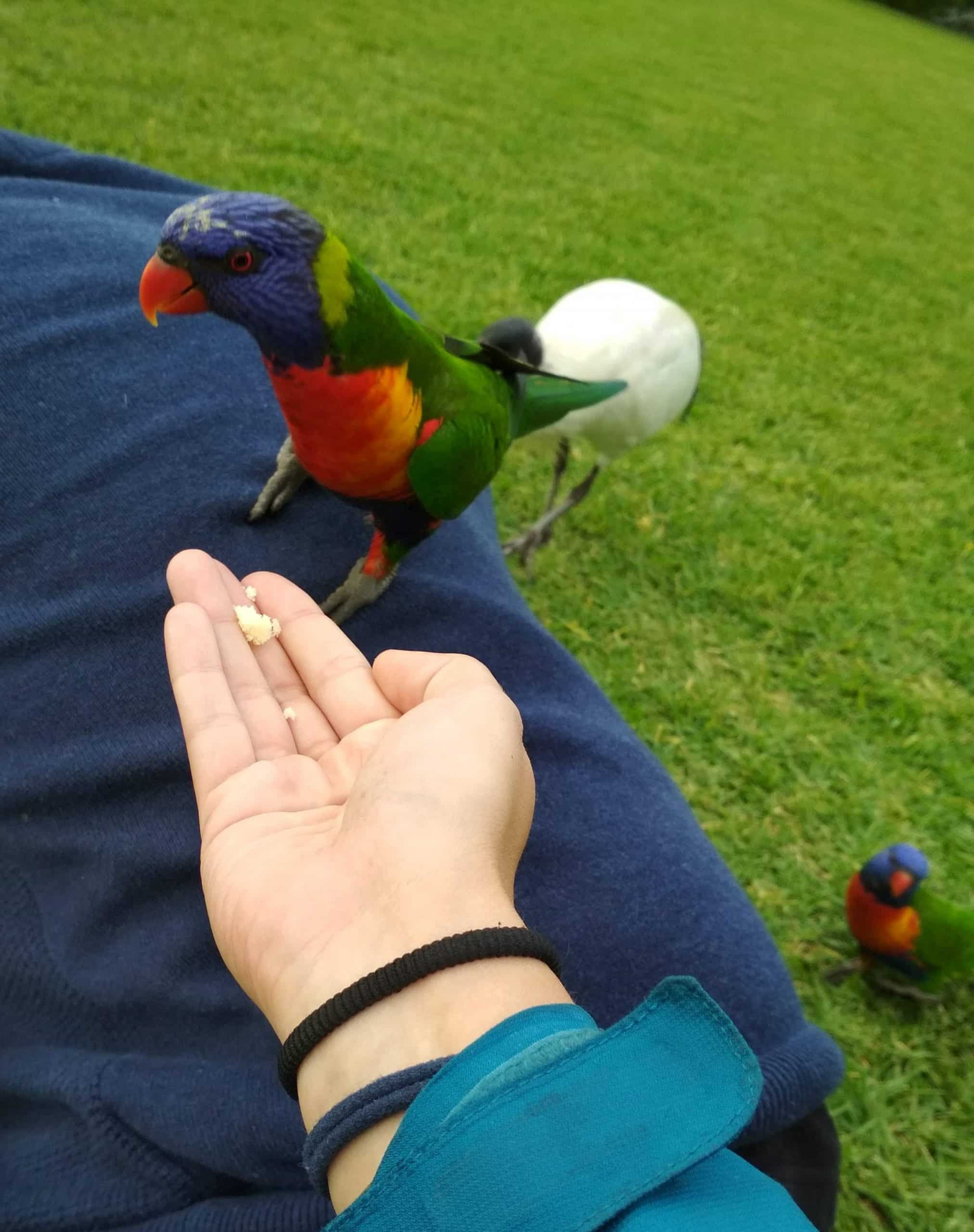 Estas imágenes están tomadas en el Parque Botánico de Sydney y acudieron a nosotros porque teníamos comida, primera toma de contacto real!!! Simplemente vinieron y se posaron sobre nosotros.